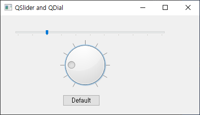 슬라이더와 다이얼은 서로 연결되어 있어서 항상 같은 값을 가지고, 푸시 버튼을 누르면 두 위젯의 값이 모두 0이 됩니다.
