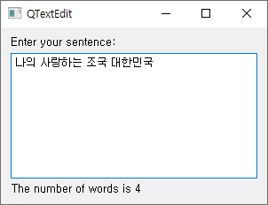 | self.lbl1 = QLabel('Enter your sentence:') self.te = QTextEdit() self.te.setAcceptRichText(False) self.lbl2 = QLabel('The number of words is 0') |