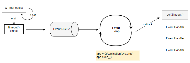 QTimer 객체는 1초에 한 번씩 주기적으로 timeout 시그널을 발생시킵니다. 발생된 timeout 시그널은 Event Queue에 입력되고 Event Loop에 의해서 등록된 슬롯 (이벤트 핸들러 메서드)인 self.timeout에 의해 처리됩니다.